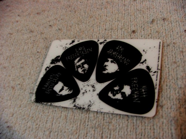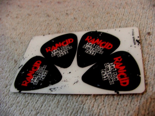 O material é todo muito bem feito. A caixinha não é naqueles papelões vagabundos que a maioria dos Digipaks por aí usam, as palhetas vêm em uma placa branca pra que se você opte por não destacar, vire um item de colecionador. De lambuja a Epitaph ainda mandou um lenço de caveira |m| e um adesivo do Rancid.