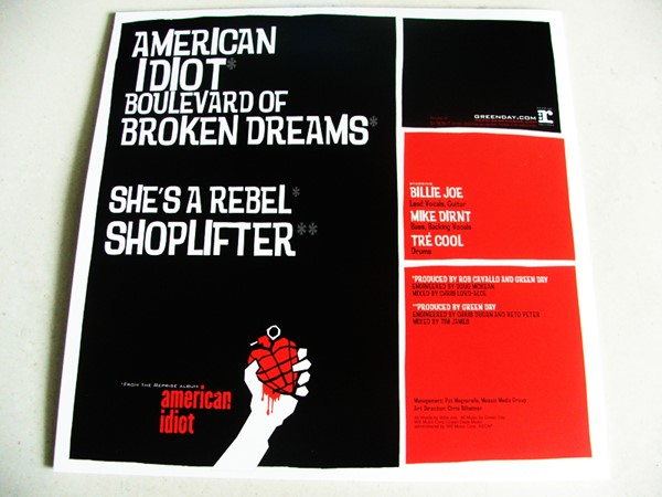 O primeiro single do álbum “American Idiot” utiliza a bela arte do disco. O disquinho ganhou uma capa bonitona e um b-side, “Shoplifter”, além de 3 músicas de estúdio iguais às do álbum.