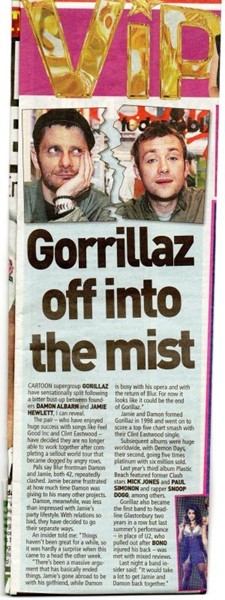 Ao contrário da notícia que publicamos ontem, o Gorillaz não irá acabar, mas sim dar um tempo em suas atividades. A confusão criada após a publicação de um artigo na revista People falando sobre o fim da banda foi esclarecida por Denholm, filho do cartonista Jamie Hewlett, um dos criadores do projeto.