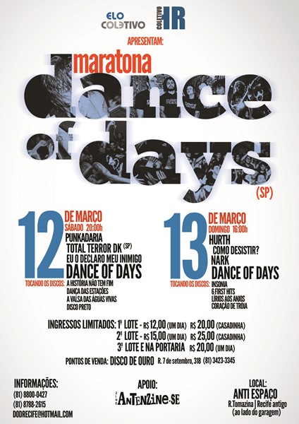 Em Março, o Dance Of Days irá até Recife para fazer duas apresentações especiais. O evento está sendo organizado pelo Elo Coletivo e acontecerá no Anti Espaço, no Recife Antigo.