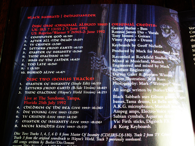 “Master Of Insanity” na versão editada para single, “Letters From Earth“, um lado-b da faixa presente naversão original do “Dehumanizer” e uma versão diferente de “Time Machine“. Além disso, o CD 2 dessa versão especial ainda traz 5 faixas gravadas no show na Florida, no dia 25 de julho de 1992. As músicas, com ótima qualidade de som (mostrando um cuidado especial na mixagem dos instrumentos), são a maravilhosa “Children Of The Sea“, “Die Young“, a poderosa e rápida “TV Crimes“, “Master Of Insanity” em uma versão nunca antes lançada e “Neon Knights“, fechando com a performance impecável de toda a banda.