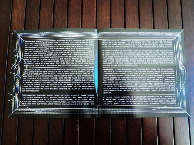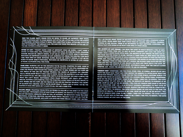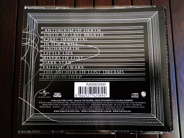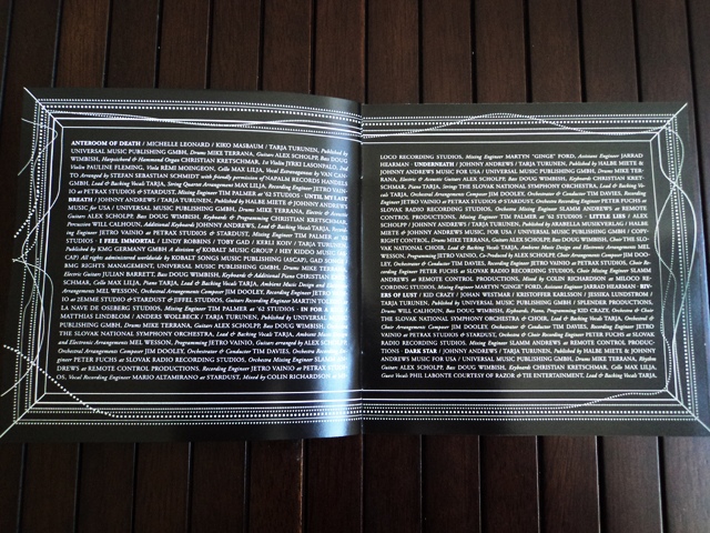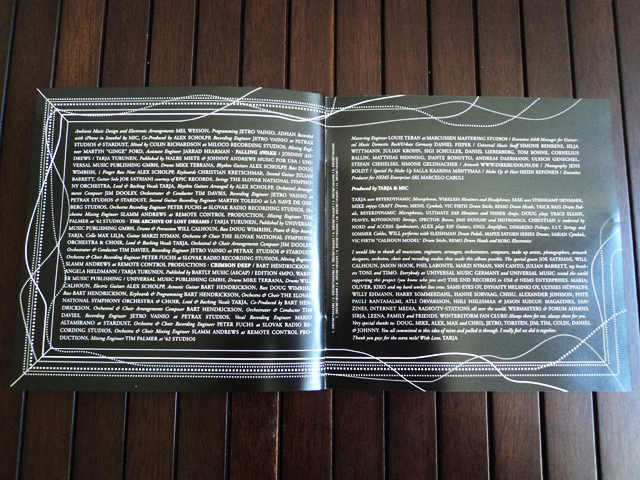 O encarte (como pode ser visto nas fotos) é basicamente preto, mas com todas as informações de gravação e composição (adoro ler essas coisas) e com fotos artísticas da Tarja. Tudo plenamente conceitual com a capa, que traz o rosto da cantora nas sombras.