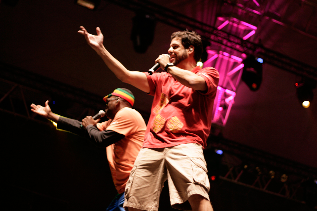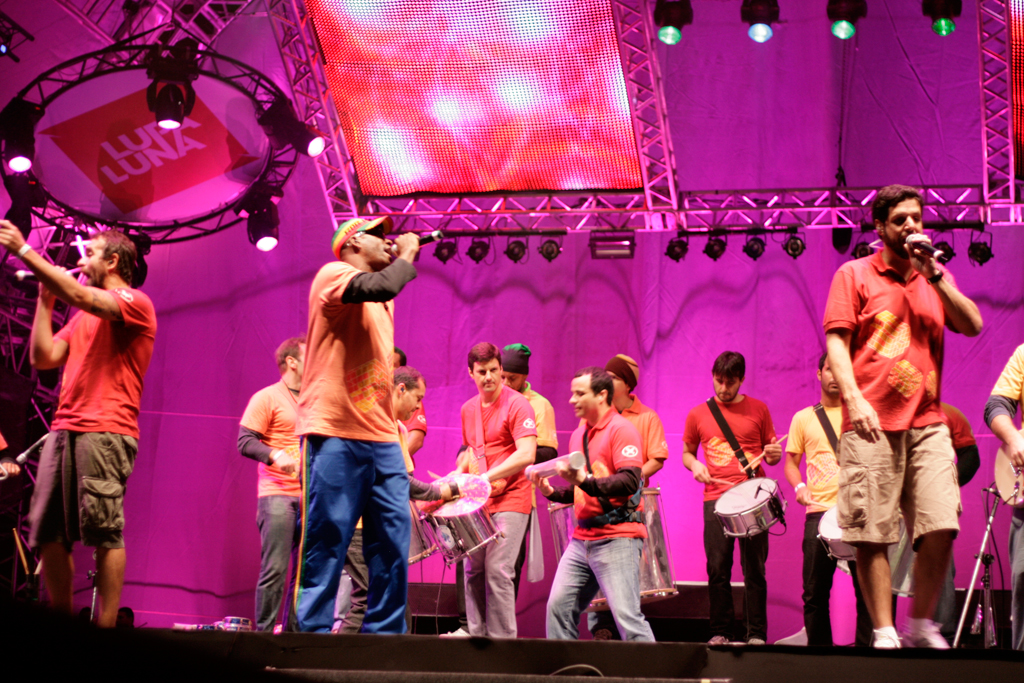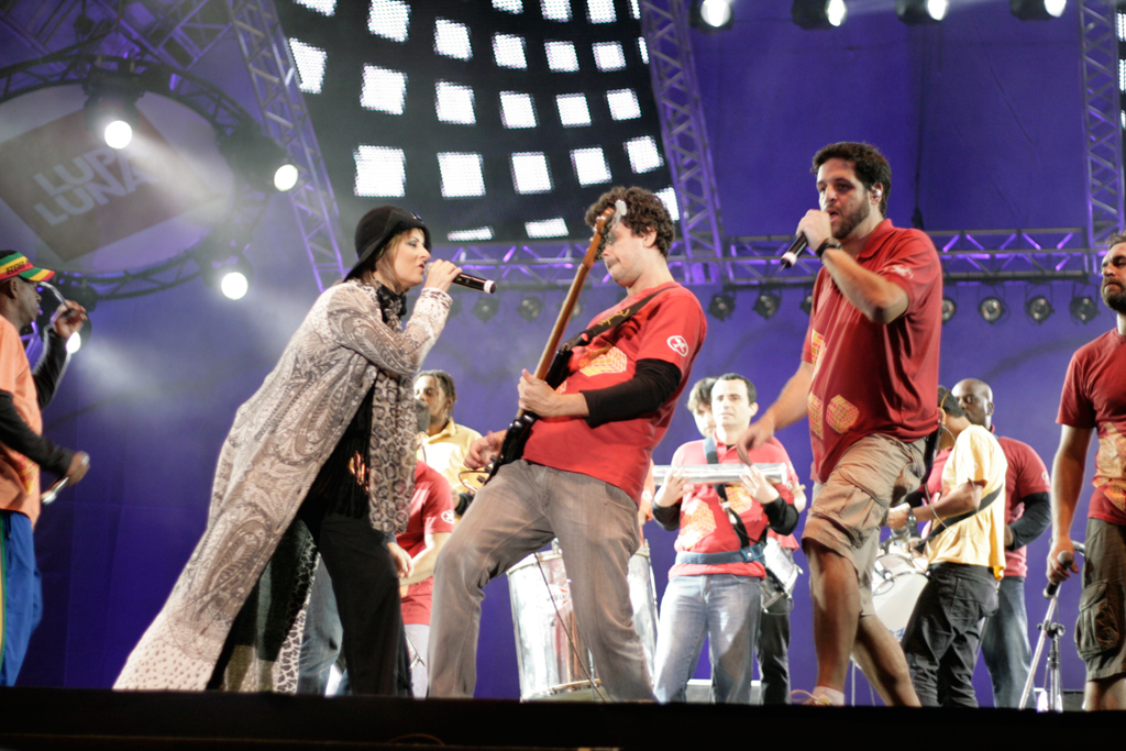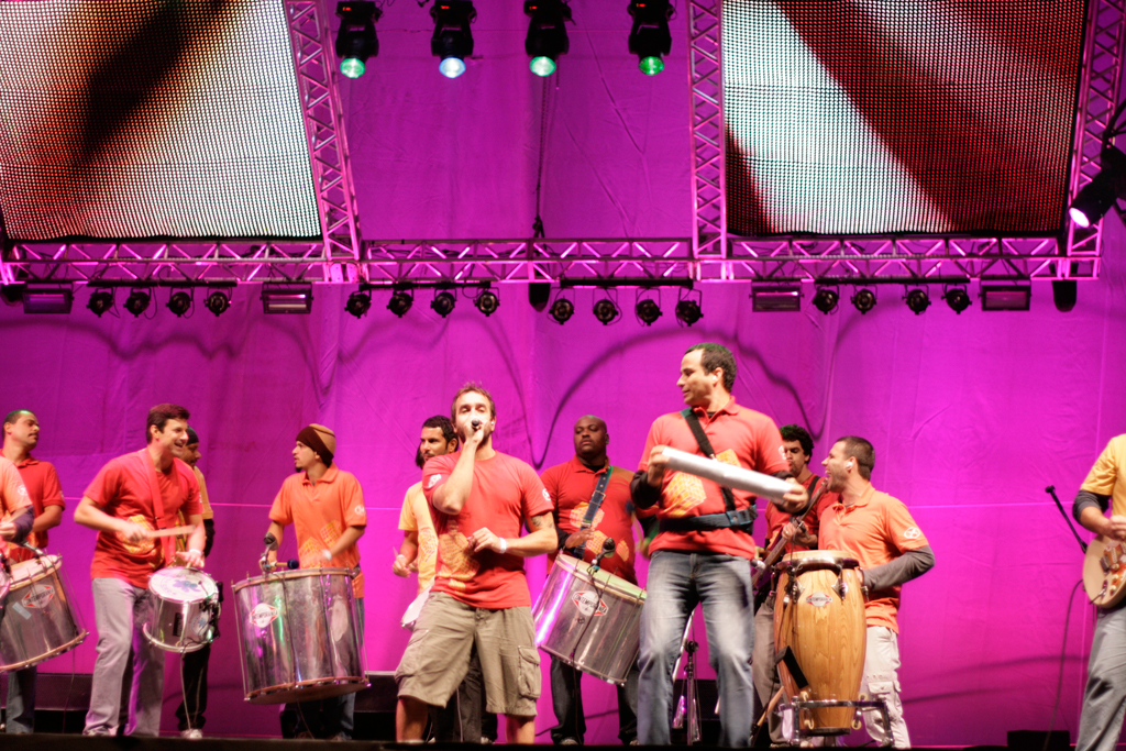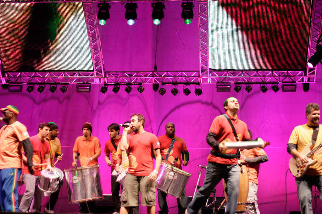 Com suas dezenas de integrantes tocando instrumentos de percussão, guitarras e cantando, a banda entoou clássicos nacionais como “Isso Aqui Tá Muito Bom”, “Descobridor Dos Sete Mares”, “Rap da Felicidade” e “País Tropical”.
