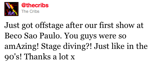 Quem perdeu ontem, por favor não perca hoje: também via twitter, a banda prometeu que o show hoje será ainda melhor. Mas depois do sucesso da primeira noite, o The Cribs já não tem mais o que provar em terras brasileiras, e somou ainda mais gente à lista dos que esperam ansiosamente pelo novo disco do trio, que começa a ser gravado no próximo semestre.