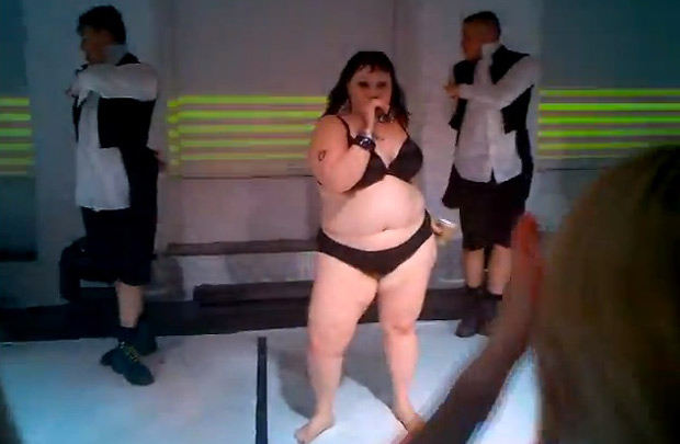 Se alguém ainda achava que Beth Ditto tinha algum problema com os quilinhos a mais, a vocalista do The Gossip mostrou o contrário em uma festa em Moscou, na Rússia. A cantora “plus-size” ficou só de calcinha e sutiã em tributo a Madonna; entrou no palco e cantou “Vogue” para a plateia, que ficou enlouquecida.