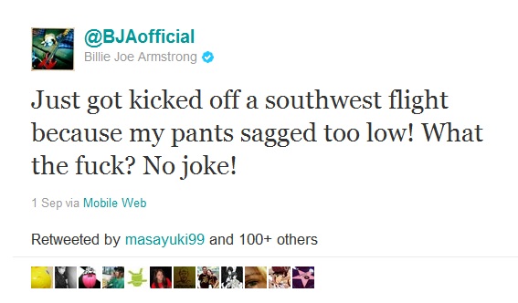 Billie Joe foi expulso de um voo da Southwest semana passada por usar calças muito baixas e discutir com as aeromoças do avião. O incidente ocorreu no aeroporto de Oakland, na Califórnia e deixou o vocalista bastante irritado, fazendo esta menção em seu twitter logo depois: