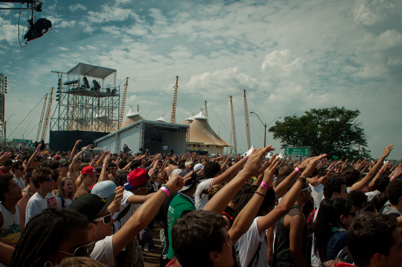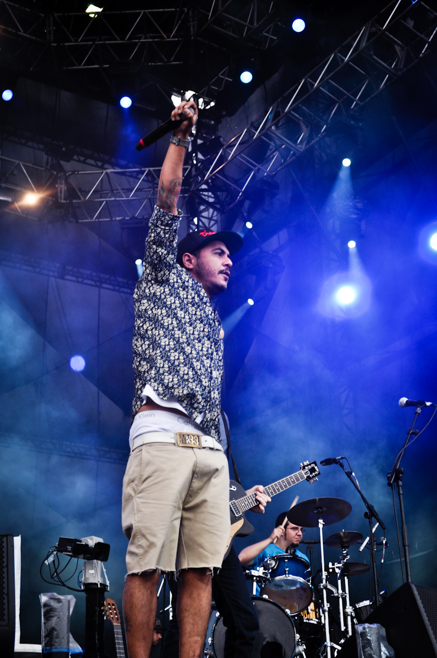 Marcelo D2 foi a primeira grande atração do dia e respondeu à altura aos gritos dos milhares de fãs que se aglomeravam em frente ao palco esperando por sua apresentação.