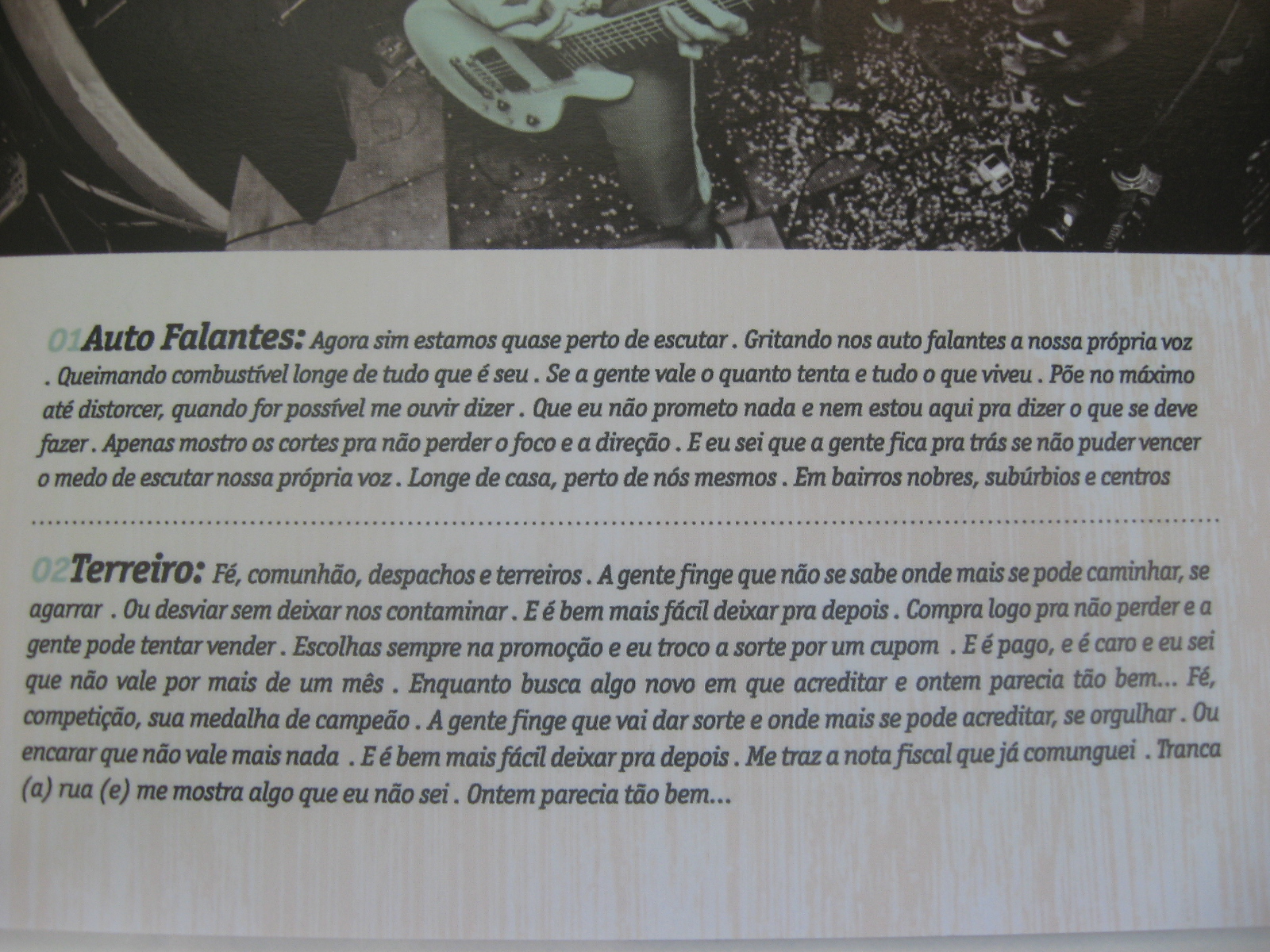 Há também músicas que abordam temas como fé (caso de “Terreiro”), relacionamento, crítica às autoridades e há até uma homenagem para o bairro onde o estúdio do grupo fica, “ Humaitá“.