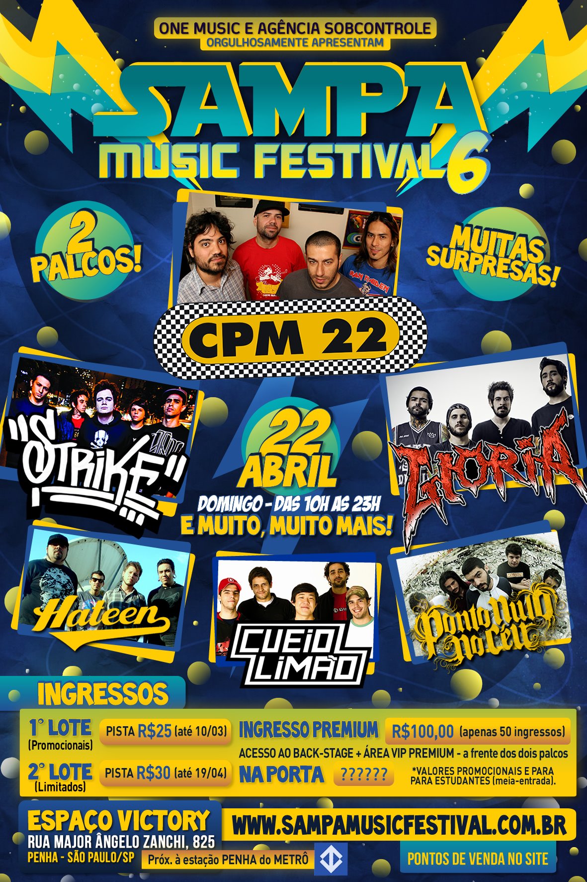 O evento também traz de volta os veteranos do Gloria, atração mais pedida pelo público ao longo das edições, os matogrossenses do CUEIO LIMÃO e mais 20 bandas independentes da grande São Paulo. Mais de quatro mil pessoas são esperadas para o Sampa Music Festival 6 que acontecerá dia 22 de abril, domingo, no Espaço Victory, ao lado da estação de metrô Penha. Os ingressos já estão à venda. Mais informações no site www.sampamusicfestival.com.br.