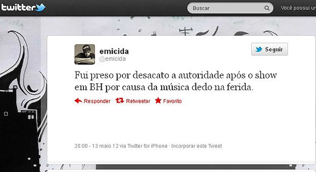 Em seu Twitter, Emicida comunicou: “Fui preso por desacato a autoridade após o show em BH por causa da música dedo na ferida”. O cantor foi detido logo após a sua saída do palco e chegou à delegacia às 19h30, conforme informou seu produtor Evandro Fiote. Emicida se apresentou em um evento gratuito no bairro Barreiro, em Belo Horizonte.