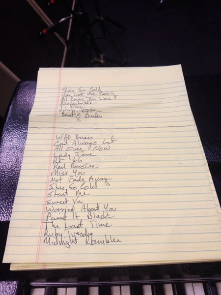 Depois de informar que fariam uma série de shows em comemoração aos seus 50 anos, os Rolling Stones agora estão liberando algumas informações para deixar qualquer fã animado. A primeira delas é uma foto postada no twitter da banda que contém o possível setlist que será apresentado nessa turnê. “Tumbling Dice”, “Honky Tonk Woman” e “Wild Horses” são alguns dos clássicos que estão no repertório. Já as novas canções, como “Doom and Gloom”, não aparecem no papel.