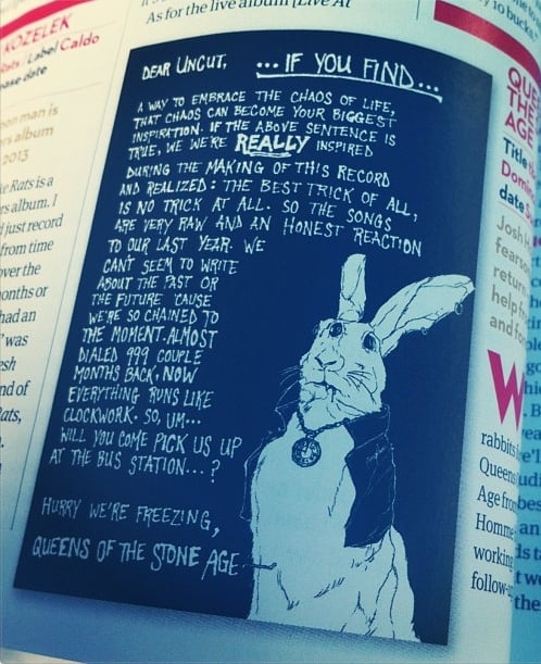 O aguardadíssimo novo álbum do Queens Of The Stone Age continua trancado a sete chaves. Se por um lado já conhecemos as inúmeras participações que o grupo trará, por outro, nada sabemos sobre como o mesmo irá soar. E para atiçar ainda mais a curiosidade dos fãs, o QOTSA publicou mais uma mensagem enigmática, a exemplo desta aqui, dessa vez na edição de Janeiro da revista Uncut.