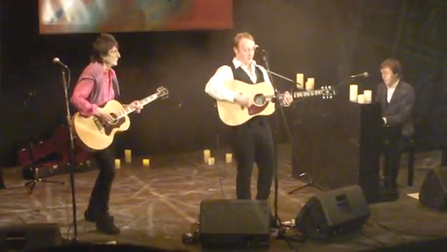 Na noite da última quarta-feira, os sortudos que estivessem assim passeando por Londres poderiam parar no show de James McCartney e ter uma grata surpresa: em cima do palco e assumindo os pianos, era possível se notar a presença carismática do papai babão Paul McCartney e do amigo e Rolling Stone Roonie Wood. Os três se apresentaram no teatro Ambassadors, com Paul no piano, Wood no violão e James no violão e voz. Confira abaixo o resultado da façanha.