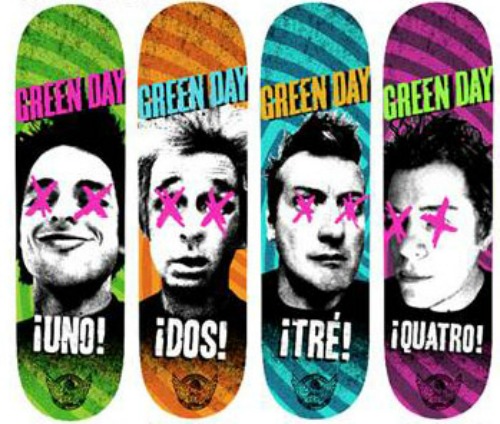 Após lançar linhas de tênis com as artes dos álbuns Dookie, American Idiot, ¡Uno!, ¡Dos! e ¡Tré!, os caras do Green Day decidiram investir em novos produtos personalizados. A banda lançará agora uma linha de skates, baseados nas artes da trilogia lançada por eles no ano passado, além também do documentário ¡Quatro!.