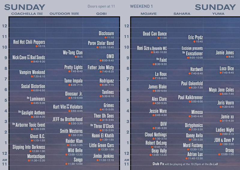 A produção divulgou nesta quarta-feira, 09 de Abril, os horários em que as bandas vão se apresentar nos seis palcos do festival: Coachella Stage, Outdoor Theatre, Gobi, Mojave, Sahara e Yuma.