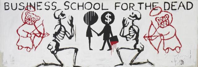 Uma pintura feita por Thom Yorke, músico sempre preocupado com as causas sociais, será leiloada no Reino Unido. O dinheiro arrecadado com a venda da obra de arte, intitulada “Business School For The Dead”, será doado ao projeto de caridade “The Trade Justice Movement“. A peça foi originalmente concebida pelo líder do Radiohead ao lado do artista Stanley Donwood para a campanha “Make Poverty History“, de 2005.