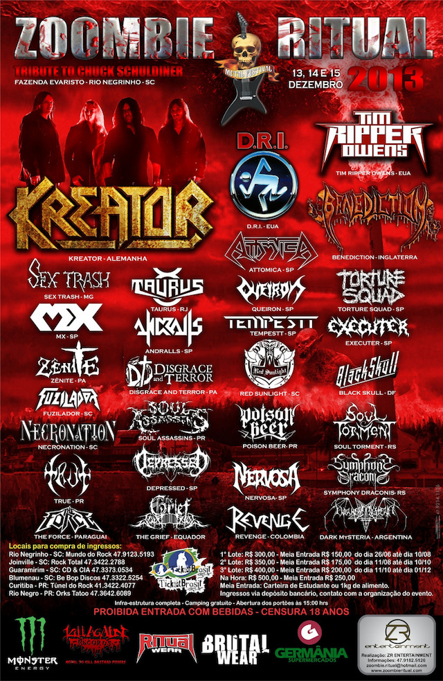 Santa Catarina vai receber novamente o Zombie Ritual Metal Fest, dessa vez com a banda Kreator, da Alemanha, no headline. Além deles, o festival também recebe Benediction (Inglaterra), Torture Squad (SP), Disgrace and Terror (PA), Soul Torment (RS), The Force (Paraguai) e Dark Mysteria (Argentina) entre várias outras em três dias de celebração ao metal mundial.