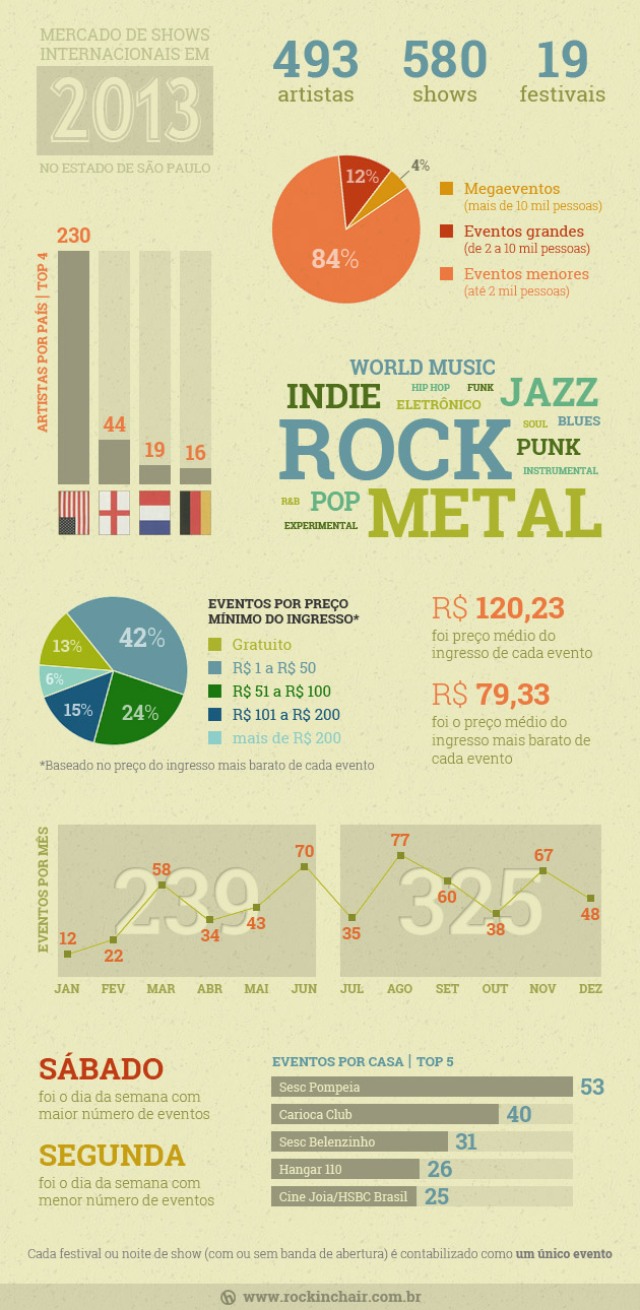 Não há mais dúvidas que o Brasil entrou definitivamente na rota de shows de grandes nomes internacionais. Sacramentando esses números, o site especializado Rockin´Chair disponibilizou um infográfico com informações sobre as apresentações. O levantamento apontou que 493 artistas estrangeiros fizeram shows no estado de São Paulo ao longo de 2013. No total, foram 723 apresentações com ingressos custando, em média, R$ 120.