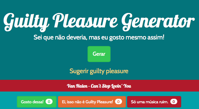 Agora, você já imaginou que legal seria se houvesse um lugar para compartilharmos, sugerirmos e lembrarmos músicas ruins de todos os tempos? Acontece que esse lugar já existe, se chama Guilty Pleasure Generator e é um site, onde você pode ouvir guilty pleasures, dizer quais são as suas canções favoritas, votar nas músicas que devem ou não ser consideradas “guilty pleasures” e  enviar sugestões.