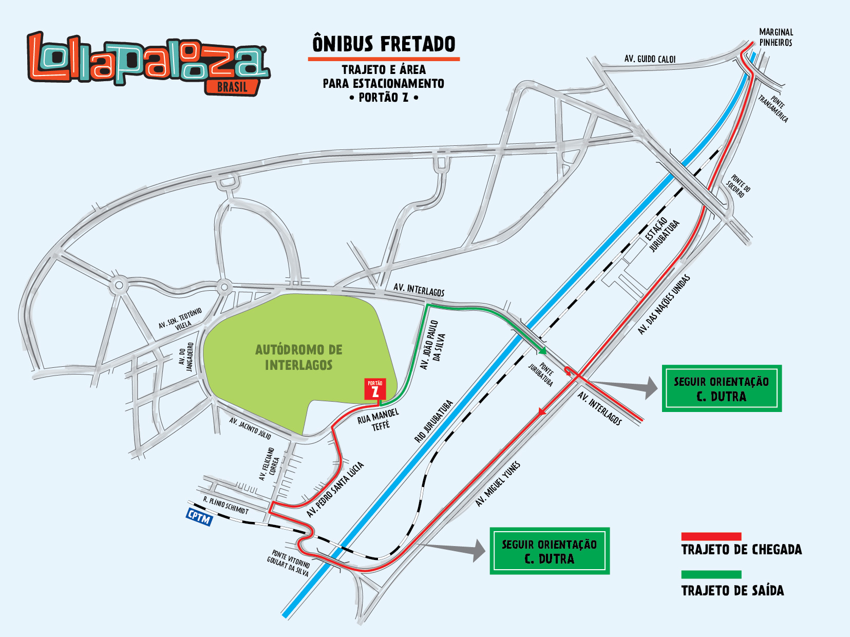 Outra opção é descer na Estação Jurubatuba, localizada na Avenida das Nações Unidas nº 22.540 (aproximadamente 3,5 km do portão A do Autódromo) e pegar qualquer ônibus sinalizado Lollapalooza no terminal. Haverá uma linha especial no retorno, das 20h à 1h, saindo do Autódromo até o Terminal Santo Amaro que funciona 24h.