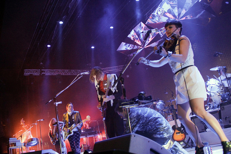 O show da banda começou pontualmente às 22h30, quando o vocalista Win Butler surgiu no palco junto com mais 11 músicos que deram um verdadeiro espetáculo de apuro técnico e versatilidade musical. Praticamente todos se revezavam entre os diversos instrumentos distribuídos por toda a extensão do palco, criando uma intensa e hipnotizante movimentação para os integrantes trocarem de instrumentos. Depois de abrir a apresentação com a faixa-título de seu disco mais recente com direito a imagens no telão do filme brasileiro de 1959 “Orfeu Negro”, Win Butler e cia emendaram em outra canção de Reflektor, “Flashbulb Eyes“, que manteve a empolgação do público. Na sequência, o Arcade Fire apresentou a faixa de seu primeiro álbum, Funeral (2005), “Neighborhood #3“, que causou comoção ainda maior na plateia.