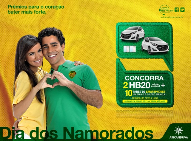 Dia dos Namorados será recheado de presentes no Shopping Aricanduva. Se você está em dúvida sobre qual presente dar para o seu namorado ou namorada esse ano, o Shopping Aricanduva pode te dar uma força e das grandes através de uma campanha bastante especial. Além de 10 pares de smartphones da marca Samsung, modelo Galaxy S4, o Shopping também irá presentear dois grandes sortudos com um carro HB20 que definitivamente irá fazer com que o casal saia mais do que feliz em um carrão novo.