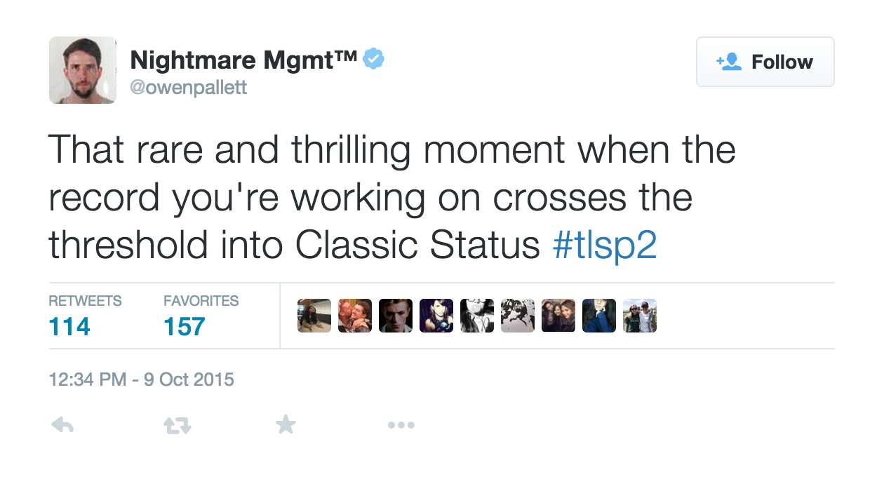 Aquele momento raro e emocionante quando o álbum em que você está trabalhando cruza o limiar para o status de ‘Clássico’. #tlsp2