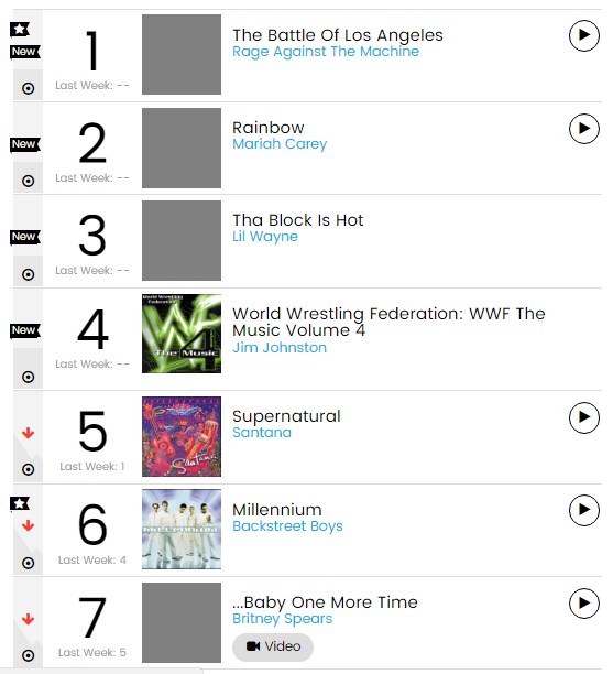 Um fato interessante é que com esses números, o Rage tirou Mariah Carey do topo, que ficou na segunda posição com seu então novo álbum, Rainbow, que vendeu 323 mil cópias na primeira semana. Em Dezembro, o então novo disco do KoRn, Issues, também chegou ao topo das paradas.