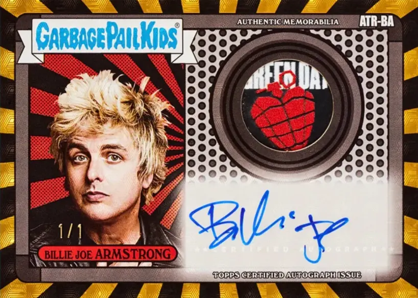 Mas o que realmente eleva essa coleção para outro patamar são os cartões autografados e os cards raros dos instrumentos da turnê. Há versões triplas (Triple Autographs) assinadas por Billie Joe Armstrong, Mike Dirnt e Tré Cool — limitadas a 25 cópias — e, ainda mais exclusivas, as American Idiot Triple Autographs — apenas 5 unidades — com fragmentos reais como palhetas e baquetas usadas em turnês.