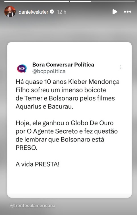 Enquanto isso, o baterista Daniel Weksler republicou em seu story o comunicado postado pelo NX Zero e em seguida compartilhou um post que celebra a vitória do filme O Agente Secreto no Globo de Ouro 2026 e relembra a prisão do ex-presidente Jair Bolsonaro.