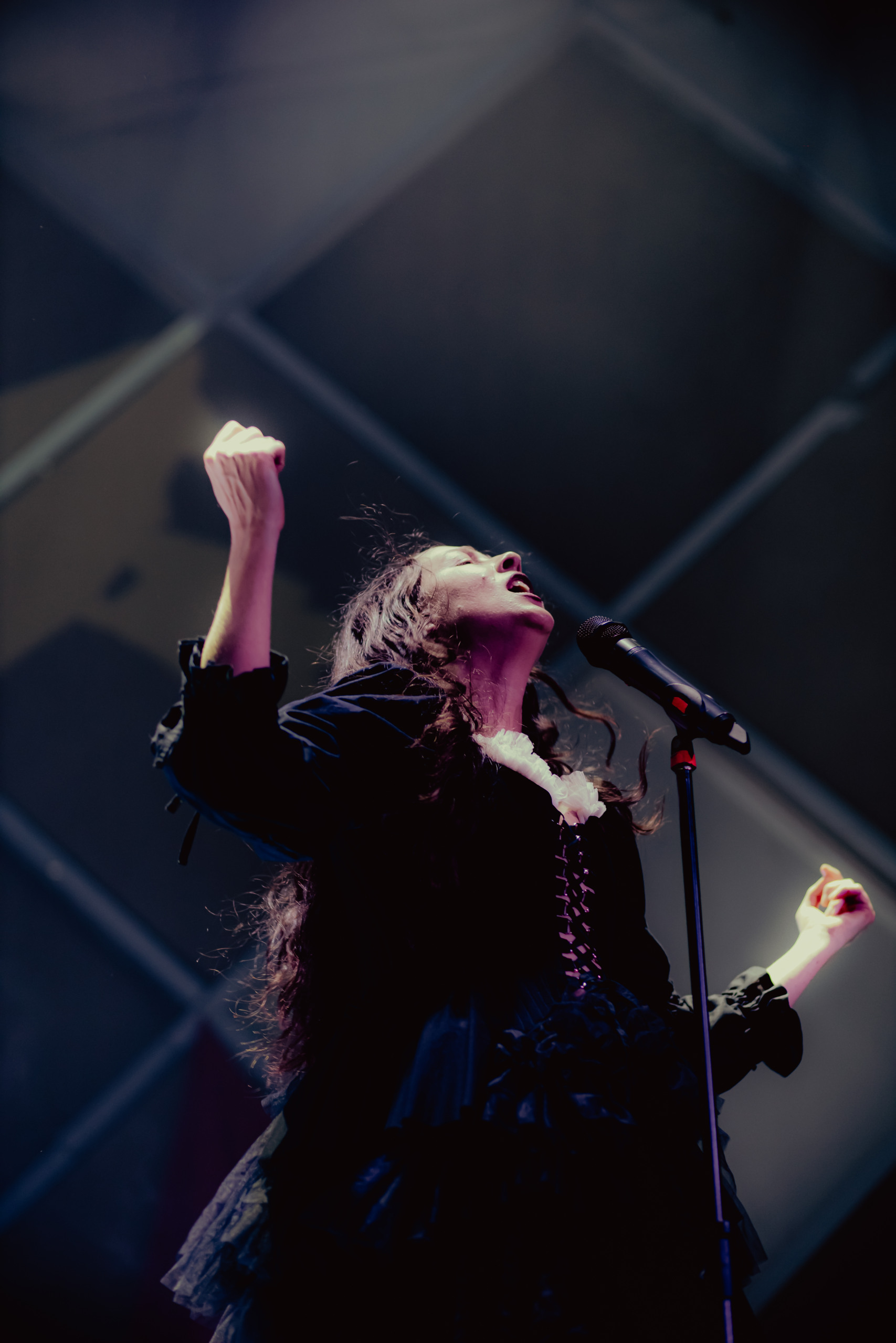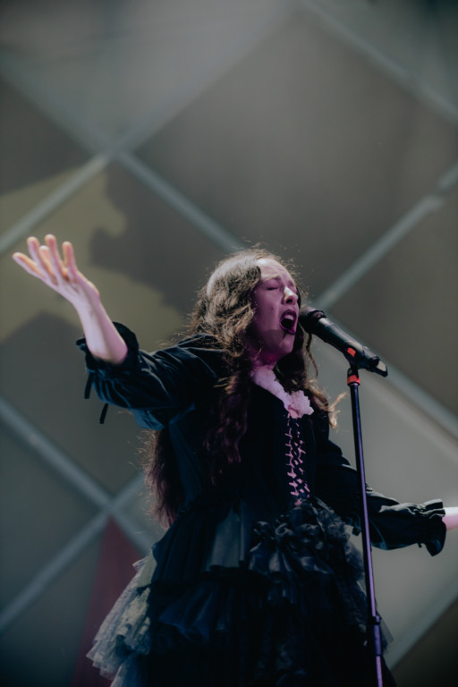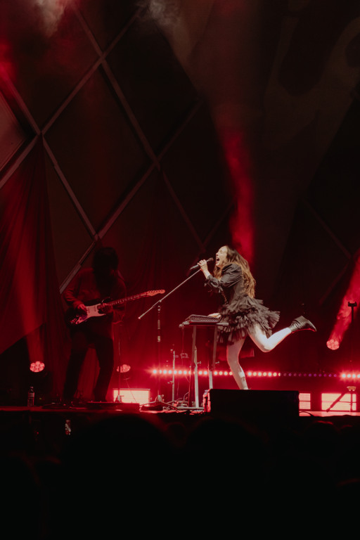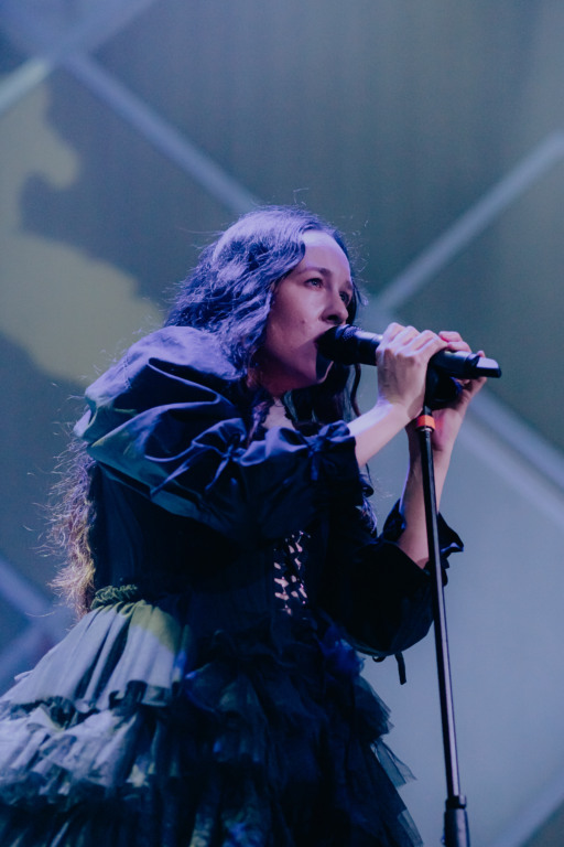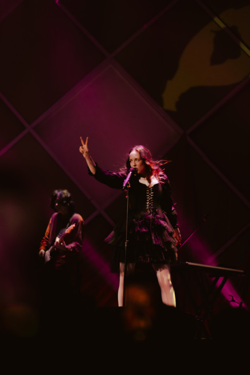 No centro da apresentação esteve o repertório que transita com naturalidade entre o pop sombrio, o synth elegante e letras confessionais que exploram identidade, desejo, controle e vulnerabilidade. Sendo assim, a artista continuou fazendo o público cantar alto com faixas como “Galina”, que ela associou à nossa palavra “Galinha”, fazendo os fãs gargalharem, e “Science”, do EP Super Sunset (2018).