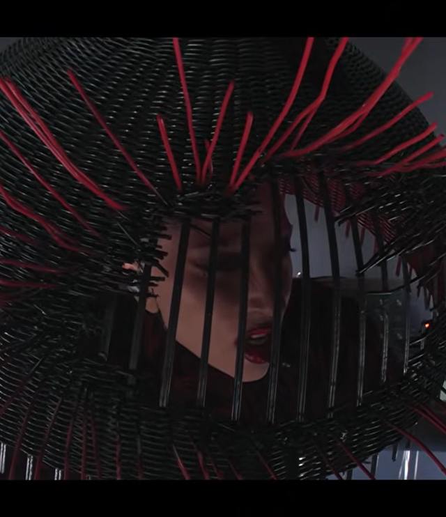 A apresentação começou em alta voltagem, com a cantora surgindo atrás de um teclado vestindo um capacete preto em formato de gaiola do qual saíam fios vermelhos, em mais um figurino marcante de sua carreira.